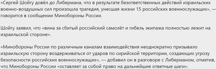 - К полномасштабному кризису не приведет, поскольку у России и Израиля много совместных интересов. Но, безусловно, инцидент приведет к каким-то последствиям. Мы видим, что Израиль поменял тактику действий в сирийском воздушном пространстве. Россия вправе принять ответные шаги.