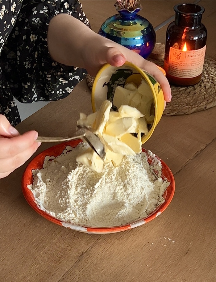 2. Добавляем холодное масло, для этого режем его на мелкие кусочки.