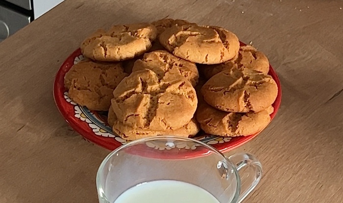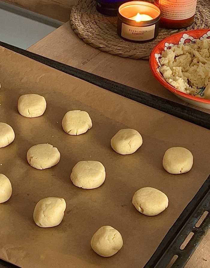 5. Формируем руками шарики величиной с грецкий орех и выкладываем на пергамент на расстоянии 5 см, так как они хорошо расплываются при выпекании. Перед духовкой чуть-чуть придавливаем верхушку стаканом.