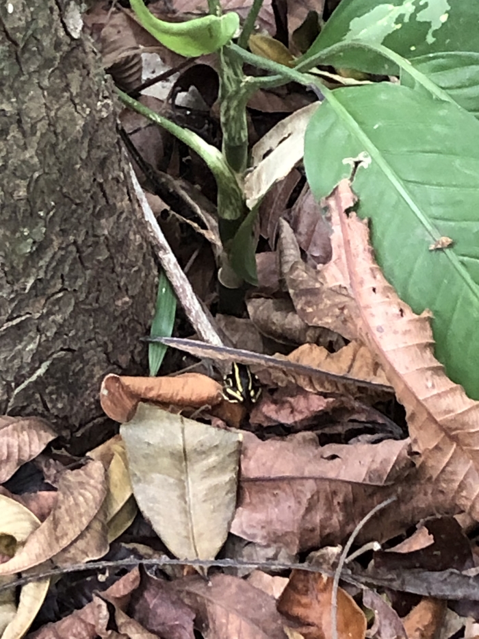 Экскурсовод не давала мне разбредаться по территории, наверное боялась, что я наступлю на ядовитых лягушек. Естественно, волновалась она не обо мне. Славные лягушата, вызывающие инфаркт миокарда, мне таки повстречались в сухих листьях. Фоток я сделал много, но все лягухи оказались как две капли похожи друг на дружку. Поэтому выложу одну, в качестве примера