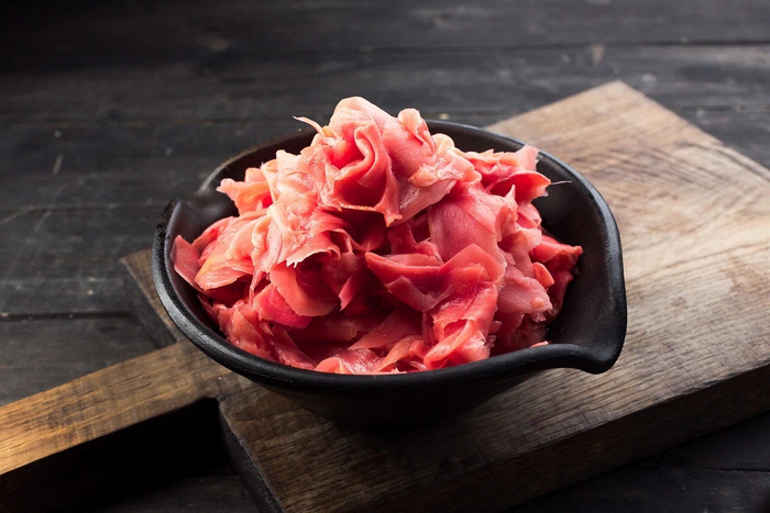 Маринованный имбирь поближе. Светло-розовый, значит - изготовлен из свежих корневищ. Лежалый при обработке не краснеет, его приходится подкрашивать. Иногда это делают с любым имбирём, чтобы получить яркий насыщенный цвет.