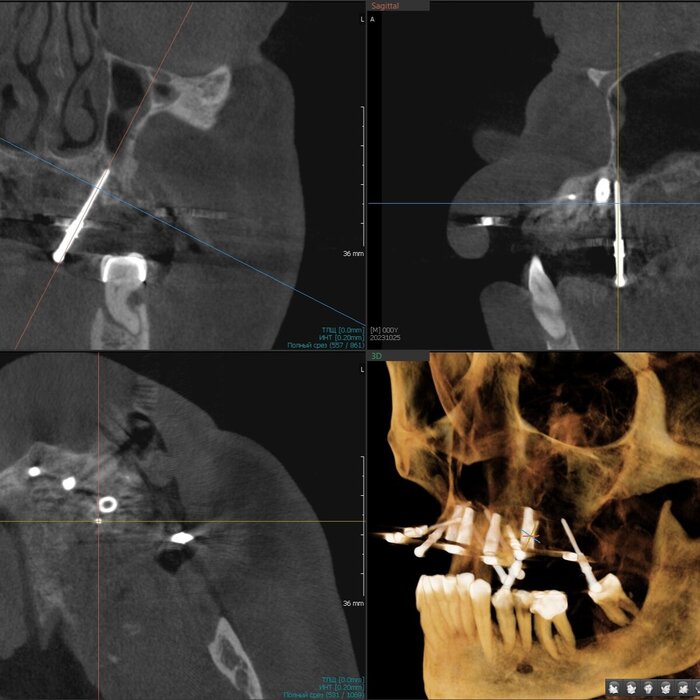Как же всё-таки у нас происходит это мероприятие? Так как мы вмешиваемся в другую область нашего тела, то стоматолог должен быть хоть немного лором. Разумеется, всё начинается с обследования, которое включает в себя трехмерный снимок, который, в идеале должен захватывать не только зубы и область наращивания, но и носовые ходы с устьями гайморовых пазух и прочими загогулинами, то есть, так называемый остиомеатальный комплекс.