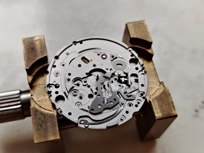Получил от продавца разрешение купить с проверкой поехал за донором, продавец ещё оказался коллегой. За его часовым столом проверяю анкерную вилку и все прочее, стрелкой отмечено 2 механизма.