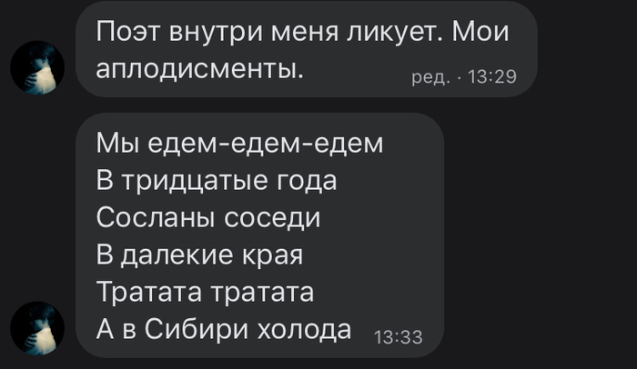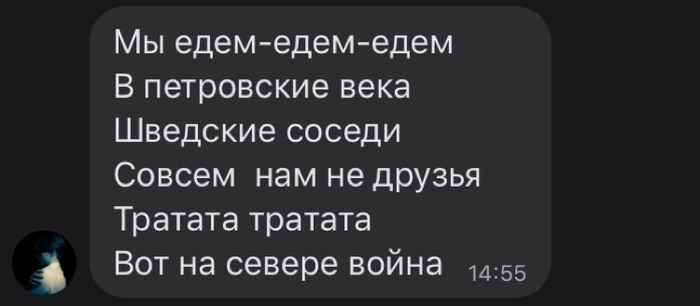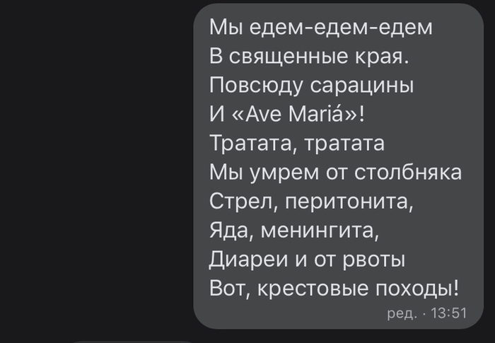 Сидели мы с моим другом и его сестрёнкой у него дома, на фоне играла музыка, ясень пень детская. Нужно сказать, что по некоторым физиологическим причинам я абсолютно не перевариваю некоторые жанры музыки и всю ту, что мне не нравится, поэтому голова после этого веселого караоке была у меня квадратная. Тем не менее я достаточно неплохо начал ностальгировать по своему собственному детству и вспомнил, как будучи мелким сам обожал эти песни, а иногда даже по настроению переписывал тексты некоторых, оставляя темп и ритм, и зачастую часу рифму. В этот момент на проигрывателе встала «Мы едем-едем-едем...» и мое больное воображение заработало на полную. Тогда я связался с другим своим другом, который часто любит писать очень неплохие стихи и обрисовал ему общую идею, как можно развлечься. Результаты в скринах, но я также предлагаю и остальным пораскинуть мозгами в комментах