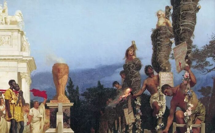 Через несколько дней после пожара христиан обвинили в поджоге города и произошли их массовые казни, организованные зрелищно и разнообразно. Нерон организовал "Игры" на аренах цирков, подобных Колизею, в ходе которых безоружных христиан подвергали ужасным мучениям- их на части разрывал дикие звери,