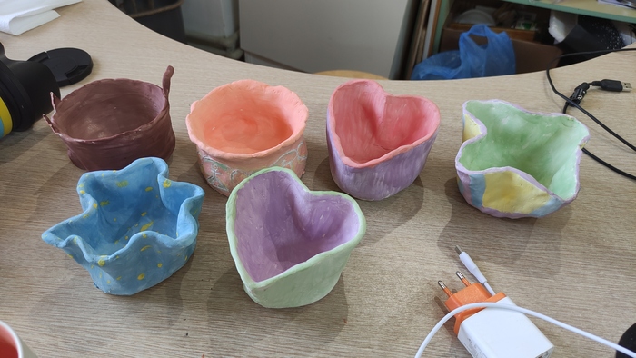 Керамические ччашки, выполненные на одном из мастер-классов, которые проводит моя супруга. А я - за техническое обеспечение, в том числе и обжигом занимаюсь. Видимо, и глазуровка на меня ляжет в ближайшее время. Поживём-увидим.