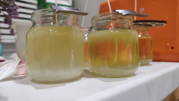 Первые свечи нашего мастера (меня). Первая варка свечей на кухне, шёпотом, при свете фонарика на телефоне, пока жена укладывает детей спать.