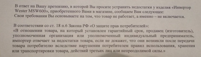 По дороге в КрымНаш возникла необходимость запаять проводку в автомобиле и я подключив 40 ваттный паяльник к инвертору благополучно справился с поставленной задачей. Далее по ходу езды возникла необходимость перекинуть карты для навигатора из ноутбука в телефон. Подключив ноутбук (сразу скажу ноутбук без батареи) лампочка на ноуте мигнула и больше не подавала признаков жизни. Ехали на двух машинах, инвертор проверили всеми способами которые знали - на каждой машине отдельно, и с подключением к прикуривателю, и подключением к аккумулятору напрямую. Пробовали еще один ноутбук (с дохлой батареей) - эффект тот же - лампочка включения ноута мигнула и все, ноут не включался. Решил что разберусь по приезду домой. Через 3 недели по приезду домой обратился с данной проблемой в магазин где покупал, где описал проблему в претензии: Ноутбук при подключении к устройству не включается. В описании недостатков к прибору сотрудник магазина написал: царапины и потертости (с этим согласен, мог поцарапать). Аппарат сдавался мной в полной комплектации: со всеми шнурами, упаковкой и всеми бумажками, в чем собственно расписался в акте сотрудник магазина.