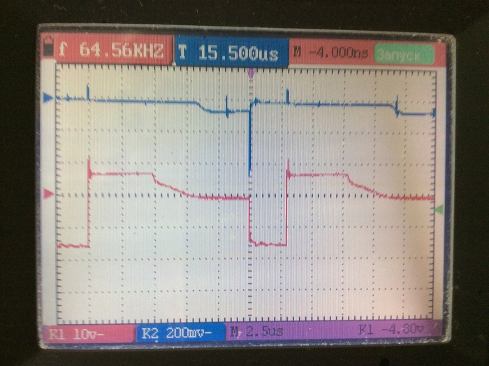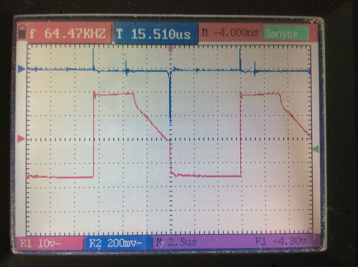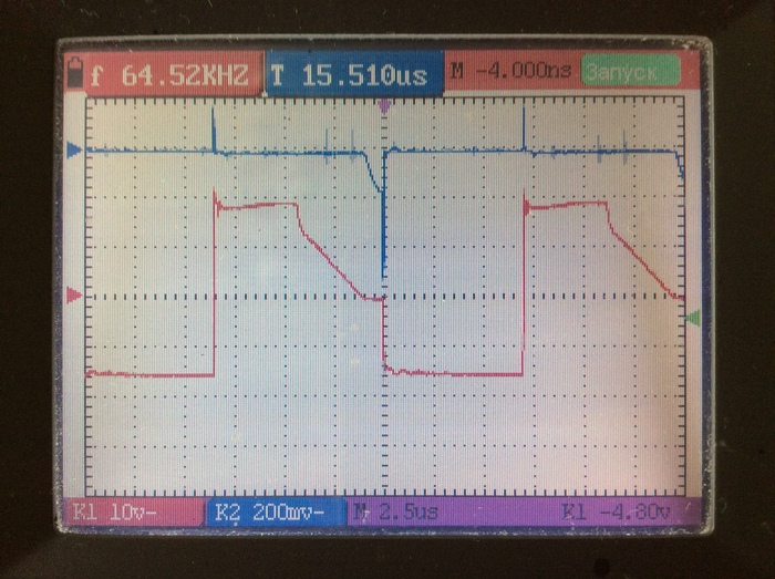 Еще раз произвел замену несправных элементов. После включения СА через ЛН 220В/300Вт обнаружил нагрев радиаторов силовых ключей. Осциллографирование показало наличие положительных импульсов на затворах ключей в момент обратного хода (ключи закрыты), т.е. происходило паразитное открытие ключей в момент, когда они должны быть закрытыми. (Прим. из теории известно, что в индуктивных цепях, площади положительных и отрицательных импульсов равны)
