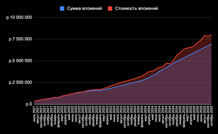 Прибыль моего портфеля за все время моего инвестирования составляет 543 521 ₽. Сюда входят, как полученные дивиденды и купоны, так и бумажная прибыль, которую я не зафиксировал. Показатель постоянно пляшет из-за волатильных акций. С учетом дивидендов и пополнений прибыль на том же уровне по сравнению с предыдущим срезом. Но это меня волнует меньше всего. Почему? Писал вот тут.