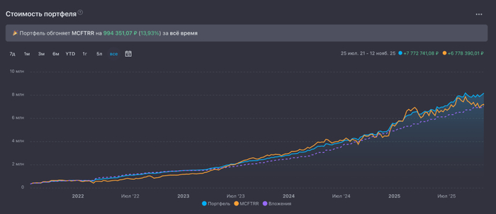 Снова 4 месяца, пополнение 800 000. Геополитические погружения не позволили перешагнуть планку 8 млн раньше, так-то эпизодически портфель превышал 8 млн и в августе, и в сентябре, но зафиксирован по итогам октября.