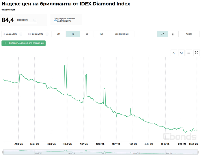 💎 Индекс цен на алмазы весь 2025 г. падал от месяца к месяцу, а ₽ был крепок (средний курс $ за 2025 г. — 83,2₽ vs. средний курс $ за 2024 г. — 92,7₽). Не стоит забывать о санкциях, которые влияют на спрос: с 1 января 2024 г. EC ввела ограничения на импорт непромышленных алмазов добытых в РФ, США с 1 марта 2024 г. запретили импорт из России непромышленных алмазов весом от 1 карата, а с 1 сентября от 0,5 карата.