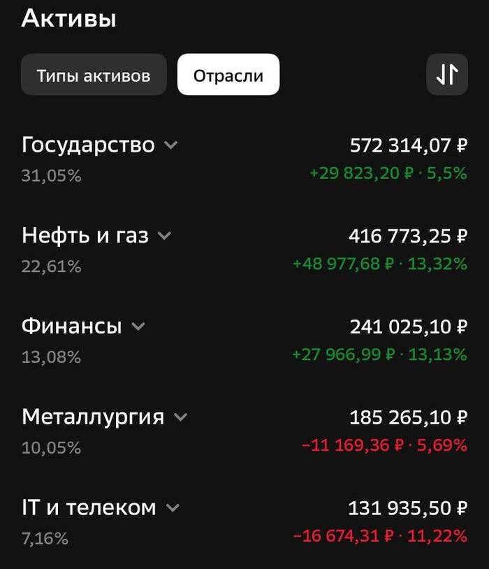 Выше ☝️ активы в моем портфеле по отраслям. Обратите внимание нефти газовая отрасль, занимает у меня второе место, из них в Газпром только вложено больше 100к, может и он выиграет от этого.