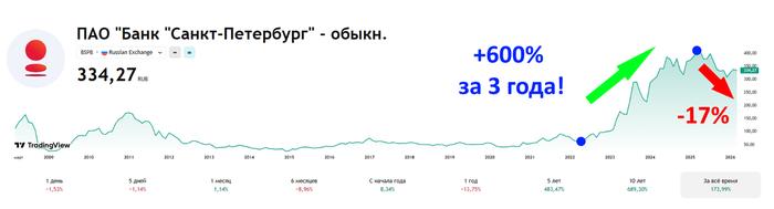 После начала СВО бумага переписала свои исторические максимумы и за 3 года выросла на 600%. Котировки разгоняли рекордные финансовые отчеты и двузначные дивиденды.