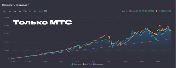 Это вымышленная история на основе бэктеста. Все совпадения случайны, а пополнения портфеля вымышлены. МТС и Ростелеком-ап настоящие.