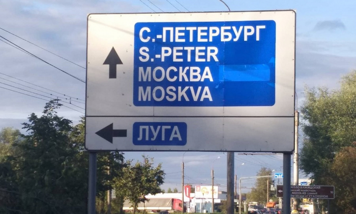 В Великом Новгороде, расположенным неподалеку, название города на дорожном знаке тоже написали некорректно. Вместо традиционного Saint Petersburg (или хотя бы допустимого St. Petersburg) на указателе красуется странное сокращение «S.-Peter». Особенно смущает дефис, который, видимо, перекочевал из русского названия города.