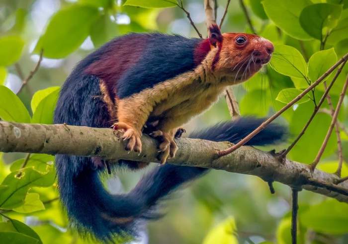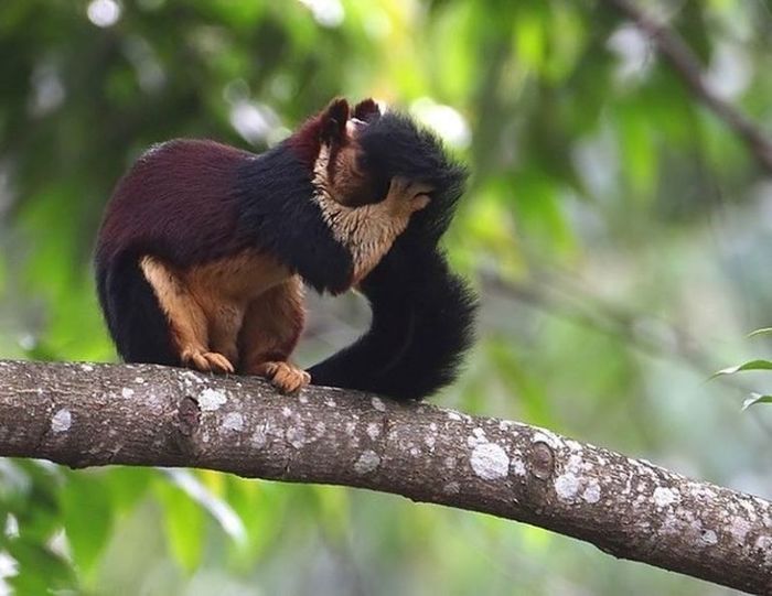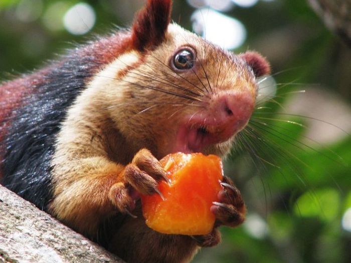 Или гигантская человекоподобная индийская белка. Весит до 3 кг, обладает расцветкой осеннего листопада и 60-сантиметровым хвостом. Анфас похожа на макрофотографию крипового жука.