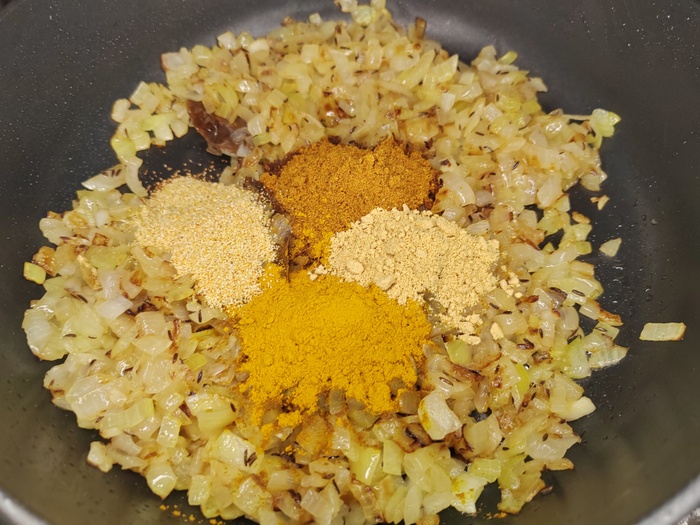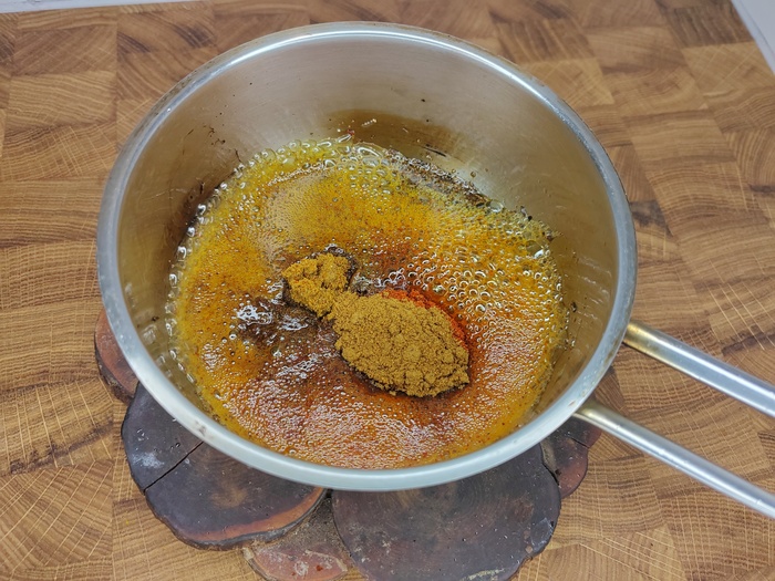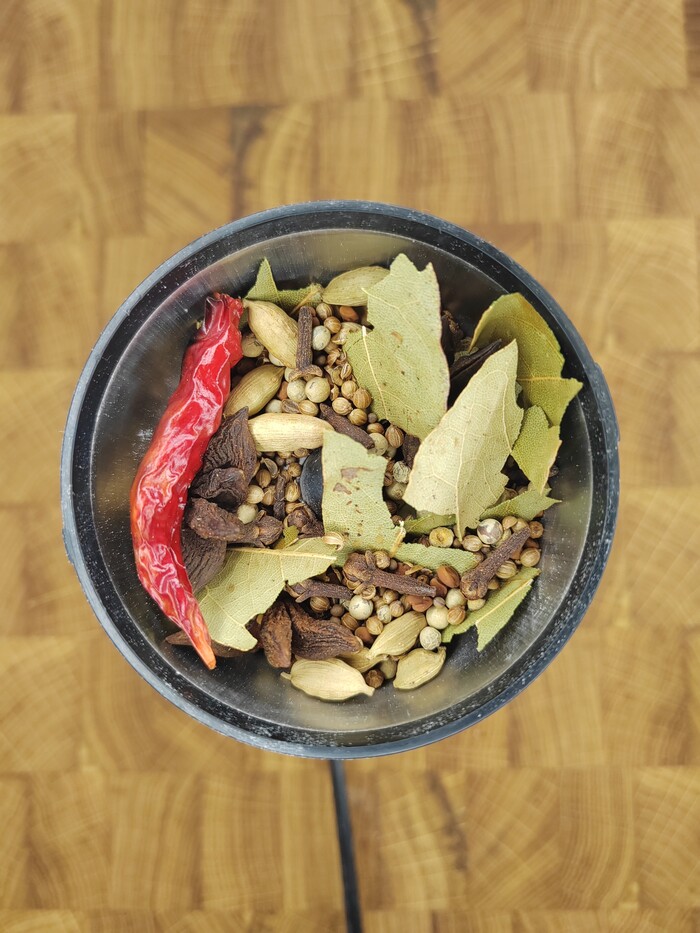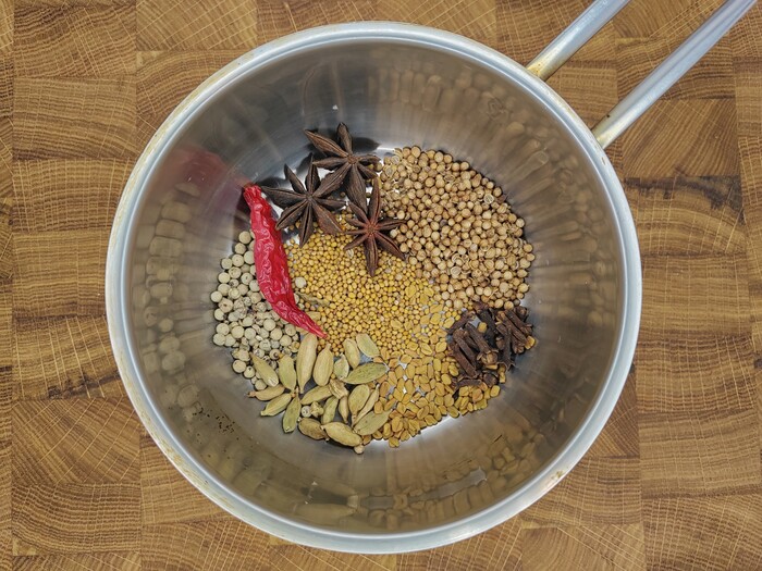 1. Сначала гарам-масала. Эти пункты актуальны, если вы - кто-то особо упоротый, ибо готовые смеси специй продаются и в околоэтнических магазинах, и на маркетплейсах (хотя, должен признать, самопальные пряности понравились мне сильнее). Ну или можно делать это не заранее, а во время второго этапа маринования. Берём все не порошковые специи, кроме лаврового листа, высыпаем их на сухую сковороду или какой-нибудь ковшик