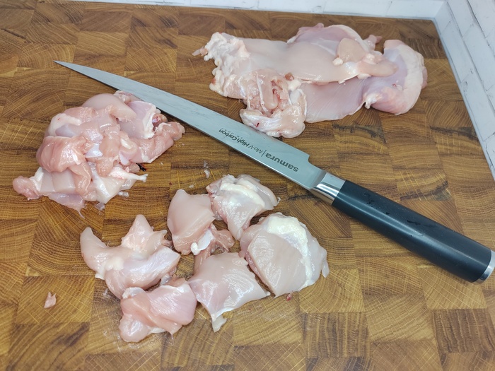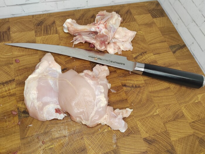 11. Дальше чистим курицу от шелухи и косточек. На самом деле, гораздо проще взять готовое филе и работать уже с ним, но в черездорожной "Пятёрочке" были только цельные бедра.