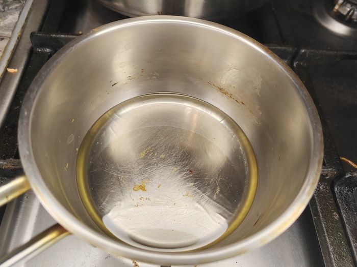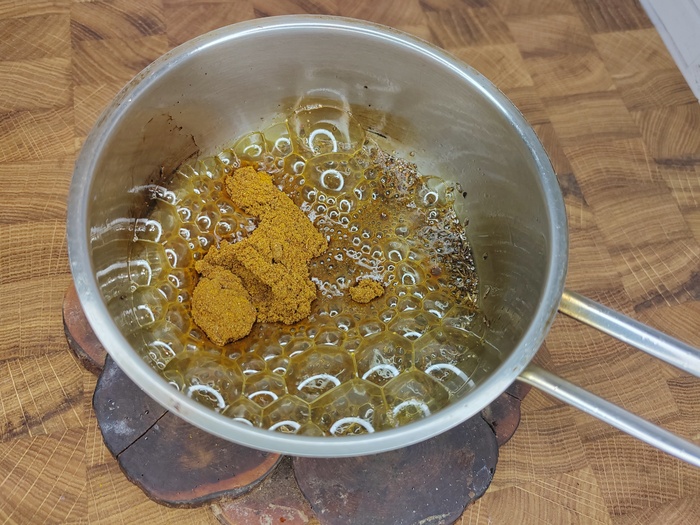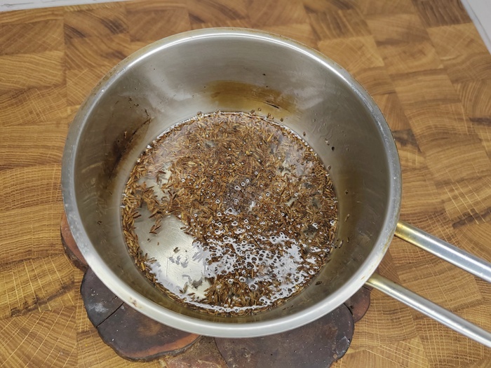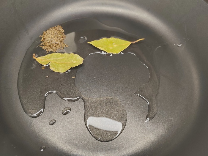 22. В общем, когда до потанцевального объединения ингредиентов в единое нечто остаётся где-то около часа, приступаем к приготовлению соуса. Он же грави. Он же подлива. Он же жижа. Сначала наливаем на сковороду растительного масла, ну или если есть, бахаем туда ложку-другую гхи. И добавляем в холодное масло зиру и лавровый лист.