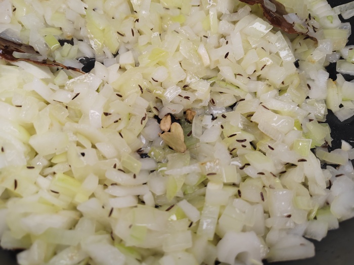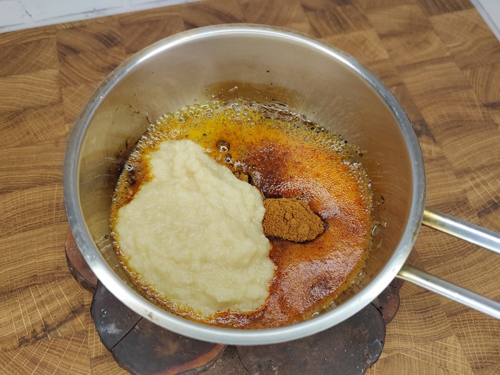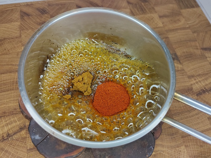 Пока маринуется, можно посмотреть фильмец, выпить пива, послушать музыку. Я успел послушать пару альбомов Ронни Джеймса Дио. За час до окончания маринования возвращаемся к рабочему месту. Нам надо нарезать мелким кубиком лук и ароматизировать масло. Индусы не заморачиваются и и жарят с цельными специями. Я отойду от их канонов и обжарив специи, процежу масло через сито. Мне не нравится хрустеть цельной гвоздикой и кардамоном.