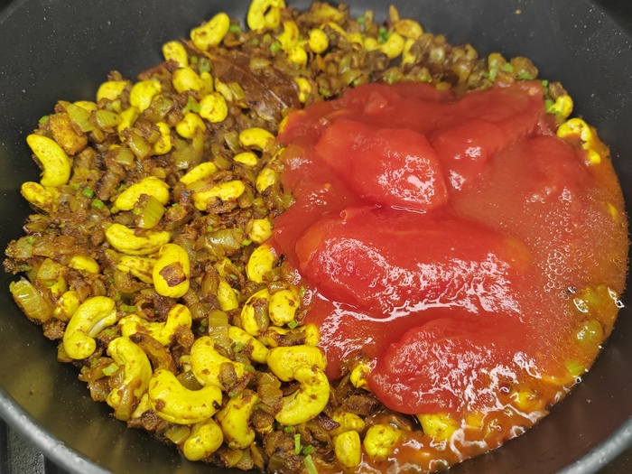 В тарелке цельные специи для ароматизации масла. Остальные это молотые специи и консервированные томаты. И мелко нарубленный лук.