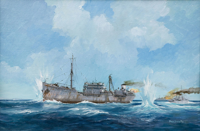 «Ондина» и «Бенгал» ведут бой с японскими вспомогательными крейсерами. Картина художника Фреда Блума, 2010 год