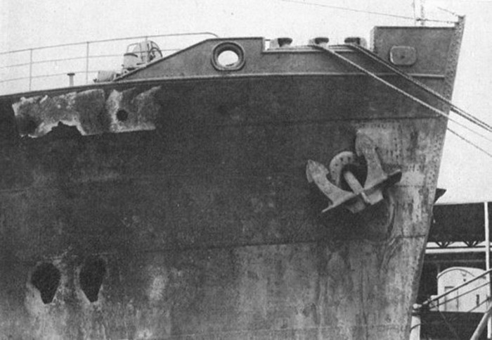 Попали. Снаряд разорвался в корме, в офицерских каютах. Жертв не было, поскольку офицеры были заняты делом, возник пожар, которые смогли быстро потушить.