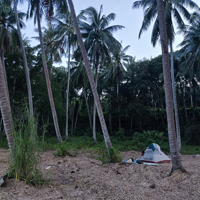С установкой палатки пришлось поосторожничать, поскольку ставить её близко к морю нельзя - ночью оно займет своё место во время прилива, а на высоком берегу все засажено кокосовыми пальмами. Мы уже слышали звук удара кокоса о землю, как кувалды, не хотелось бы от такого проснуться...