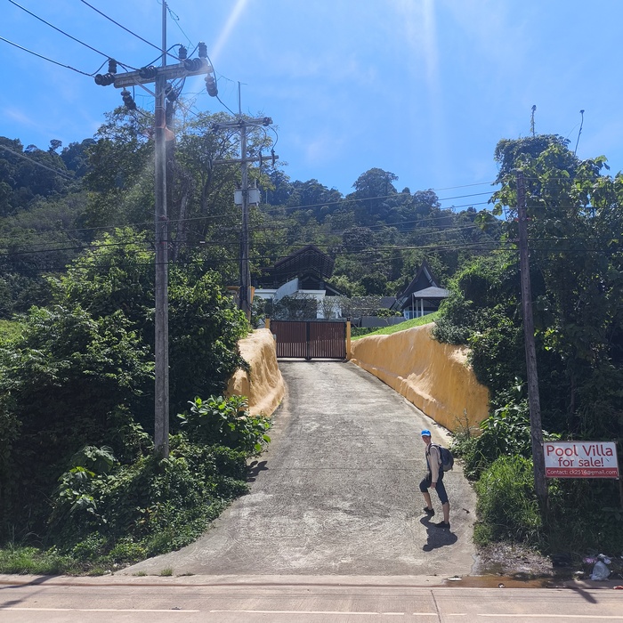 Миновав холмы, мы спустились к другой стороне острова. Появилось множество построек. У одной из таких вилл на продажу угол подъема выглядел градусов на 60, может это и стало причиной её непопулярности? Попробуй заберись.