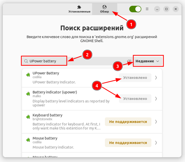 Для Fedora , Arch/Manjaro Linux с GNOME 42/43 просто откройте ссылку Battery indicator или «UPower Battery» и используйте переключатель ВКЛ/ВЫКЛ, чтобы установить ее. И установите приложение Gnome Extensions из Gnome Software для настройки расширений.