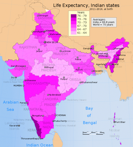 Самый высокий уровень продолжительности жизни в Индии.