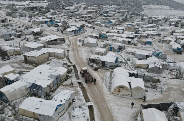В Сирии снег покрыл крыши палаток в лагере для беженцев.