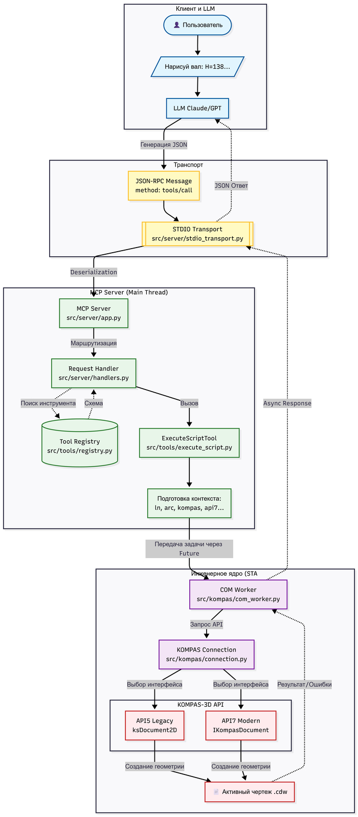 Если что-то идёт не так (документ не открыт, КОМПАС завис, COM-соединение оборвалось), сервер возвращает структурированную ошибку с описанием проблемы и рекомендациями. Модель может попробовать переподключиться через reconnect() или создать новый документ.