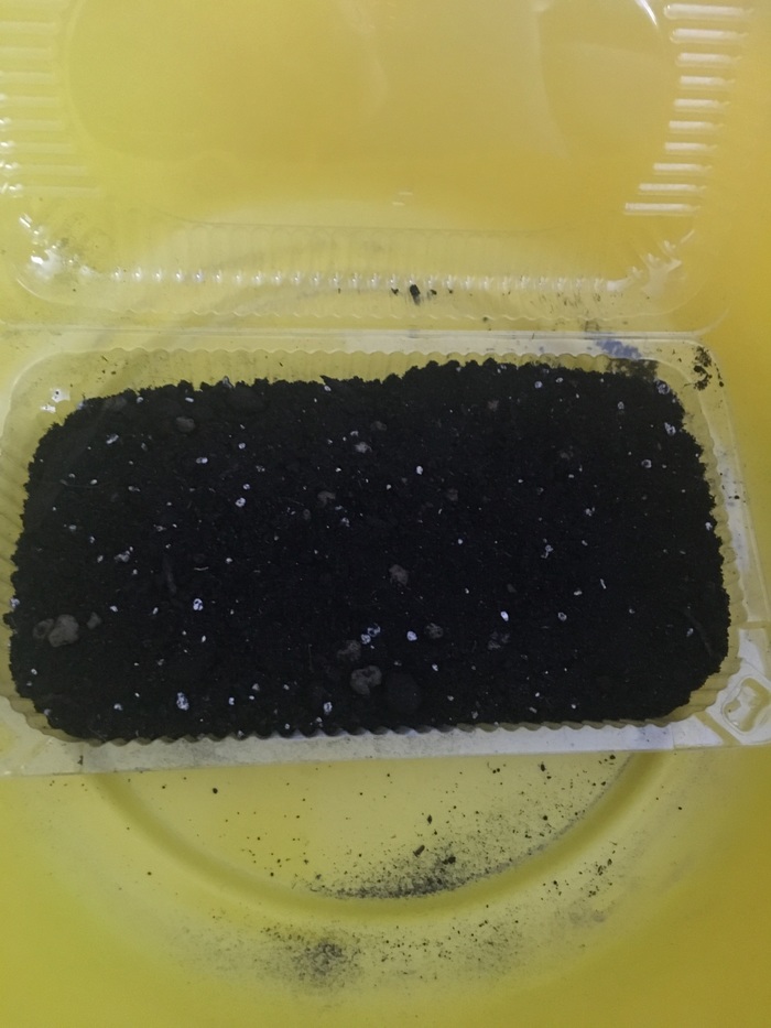 Палочкой для суши, делаем лунки и раскладываем по 2-3 семечка в каждую лунку. Забрызгиваем всё пульверизатором, осталось только закрыть крышку и подписать сверху маркёром где фиолетово-плодный а где зелёно-плодный.