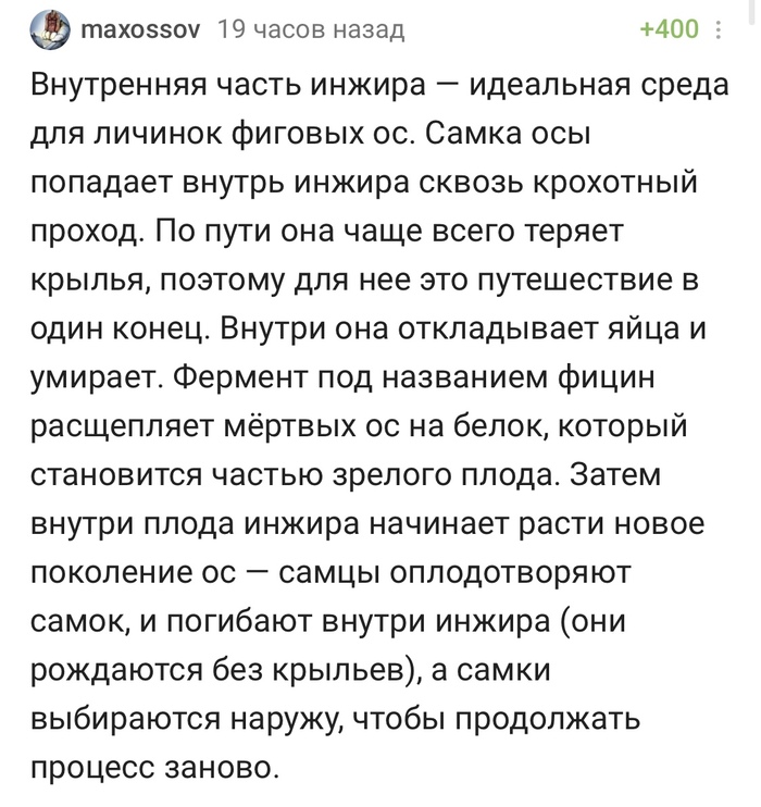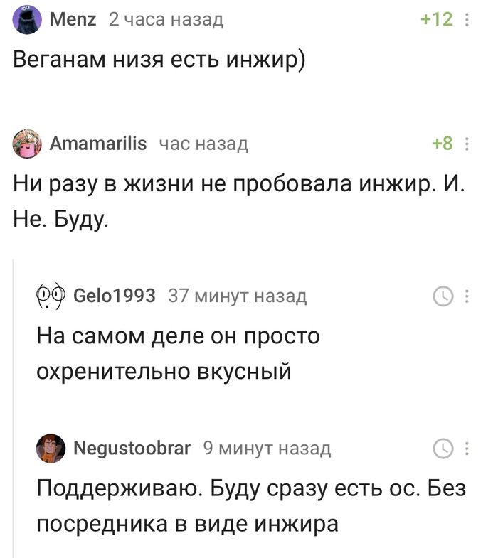 Инжир, я никогда не ела этого фрукта, хотя я уже более 10 лет живу в регионе, где он растёт. Но начнём сначала - первые несколько лет инжир проходил мимо, потом я если и вспомнила о нем, то было или рано, или уже поздно...а потом последние лет 6 я принципиально его не ем. Просто как-то сошлись в голове мысли, что многое испробовала в этой жизни и неизведанного остаётся все меньше и меньше. И я этот инжир, а точнее моё восприятие к нему хочу оставить на потом, или может разделить с кем то. Может это и глупо...а у вас есть подобные мысли? Может это не с продуктами, а с чем то другим?