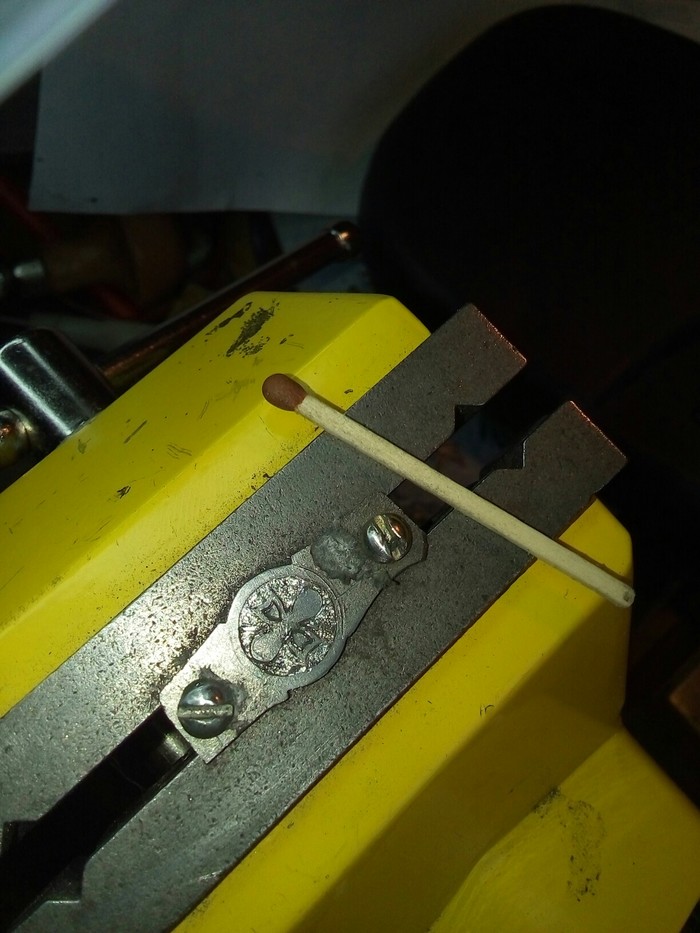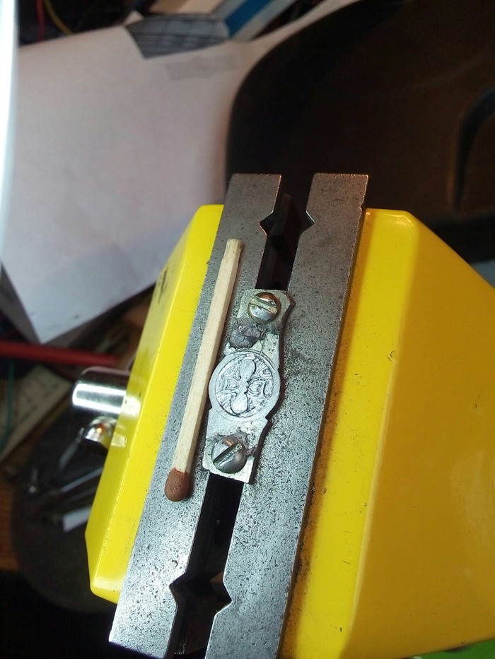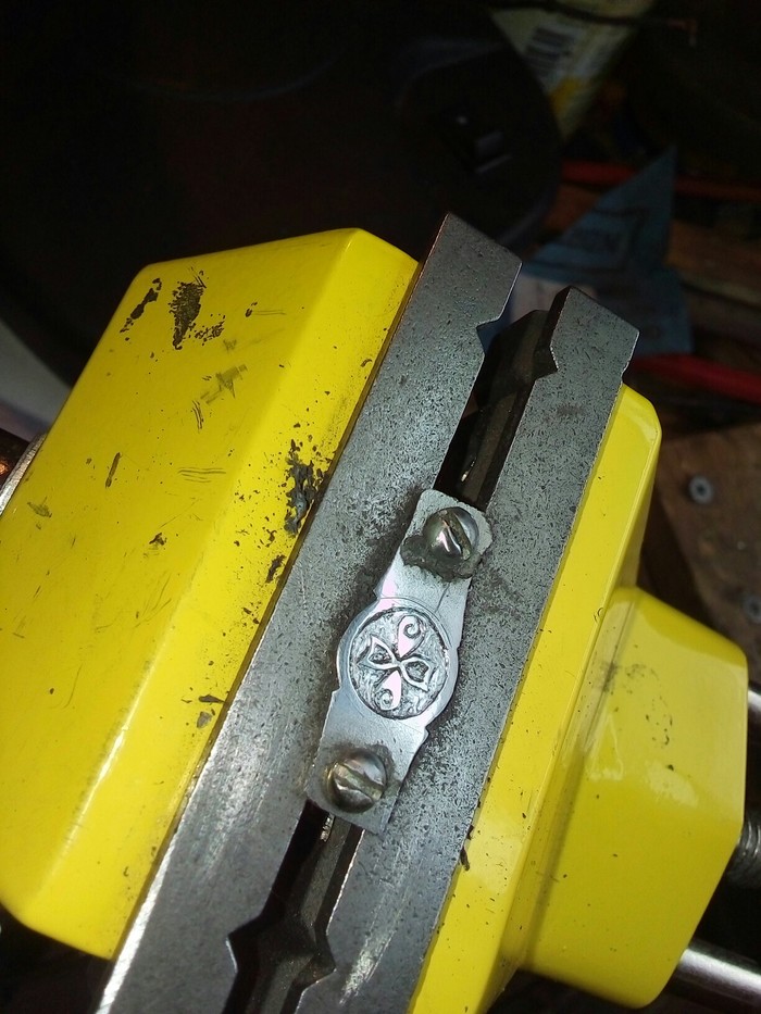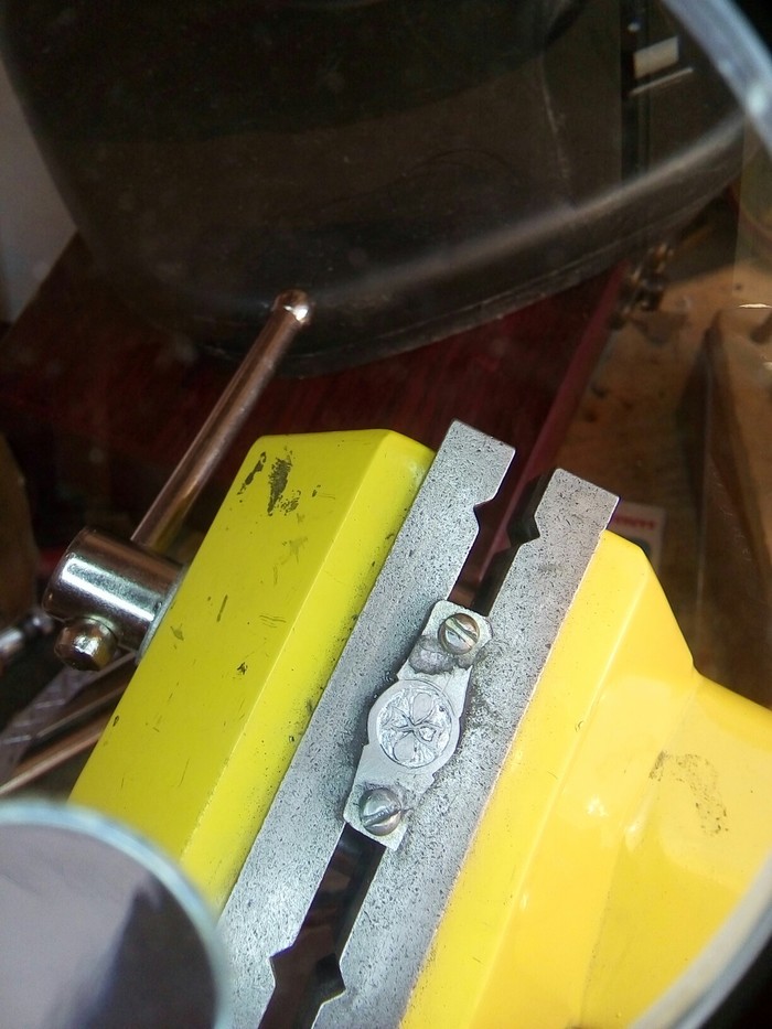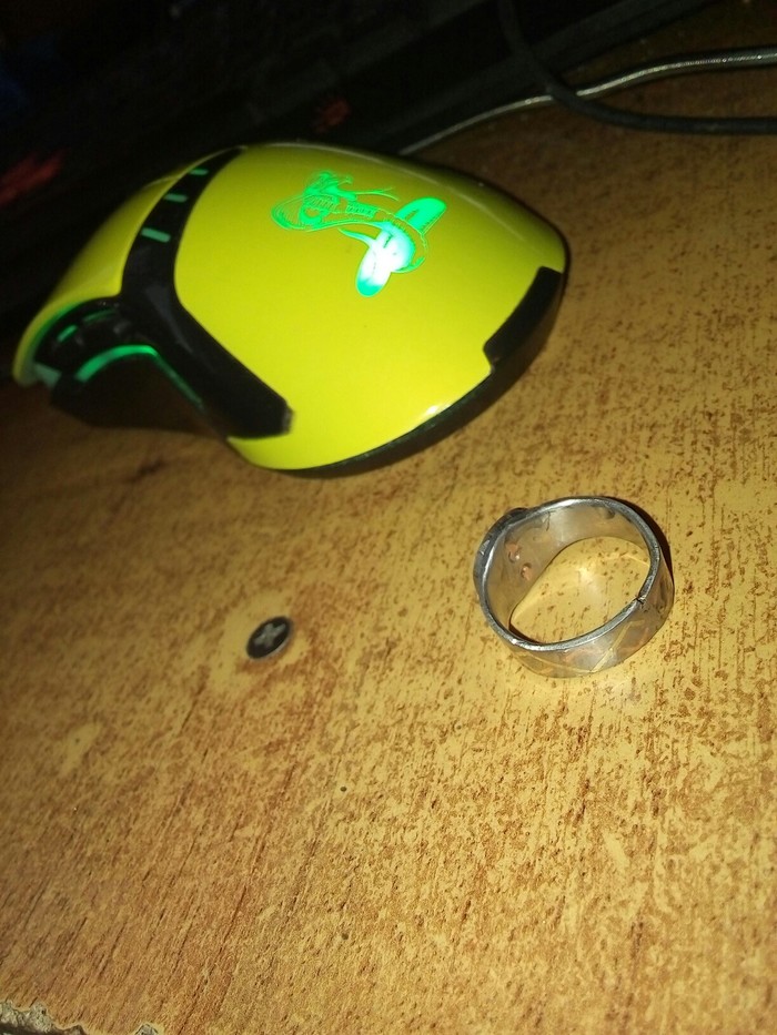 Когда "циферблат" был готов, я высверлил в нём два отверстия в 0.8 мм. На них же была нарезана резьба. Сами части кольца соединяются двумя медными винтиками, которые я расклепал, что обеспечило приемлемую прочность.