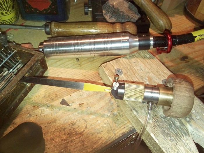 Началось всё с выпиливания ободка из куска стали в 1.5 мм и его разметки. Вся гравировка была выполнена пневмоштихелем. К сожалению я не сделал фоток приготовленных к инкрустации канавок.