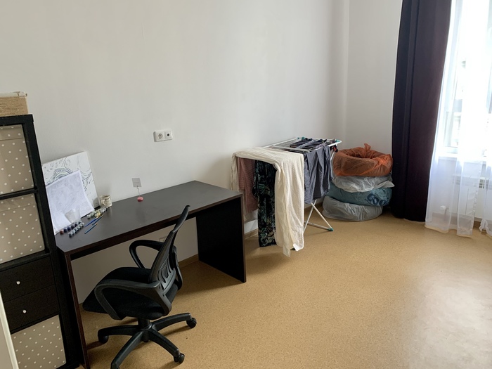 А здесь иногда тюленю я. Из казенного имущества к нам перешел диван, телевизор, подставка под тв, стол и компьютерный стул. Полку дня книг и стеллаж к моему столу докупили. Сушилки, кстати тоже не было (что совсем не странно, но я на подсознательном уровне почему-то ожидала место для сушки).Ну и шины хранятся в зале временно, там скоро будет пуфик. Не храните шины дома. Не надо.