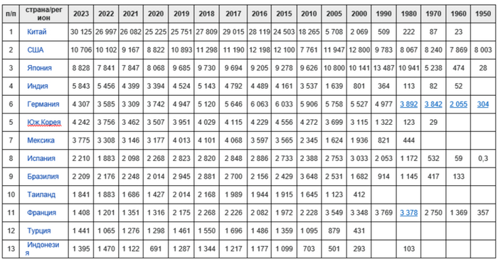 Спад производства во время пандемии коснулся всех стран без исключения, но вот выходят из этой ямы все по-разному. В Германии спад производства, начавшийся еще до эпохи КОВИД (в 2017 году), достиг дна в 2021 году, опустившись ниже уровня 1980 года. Отскок наметился, но идет крайне медленно. Автопроизводство США отыгрывает быстрее, но некогда мировой лидер стремительно уступает Китаю долю в общем мировом производстве. Китай обгоняет США уже 3 с трехкратным преимуществом. Франция сильно просела и не смогла восстановить свои позиции. Японию также коснулось снижение, но оно не существенно при этом в 2023 году она уверенно стремится к допандемийному уровню производства. Обогнать свой допандемийный уровень смогли Южная Корея и Индия. А вот Китай, совершивший головокружительный прыжок в периоде 2005-2015 (+20 млн. авто в год), получил еще один значительный рост в 2023 (+ 4 млн. авто в год). Китай вне досягаемости.