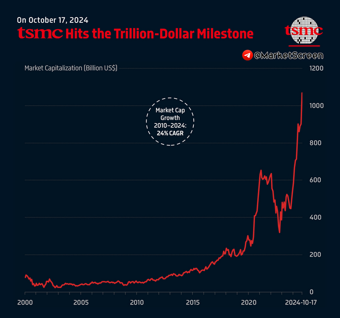 С 2010 года рыночная капитализация TSMC росла с ежегодным темпом роста (CAGR) в 24%, при этом чистая выручка и чистый доход от продаж увеличивались на 14% в год за тот же период.