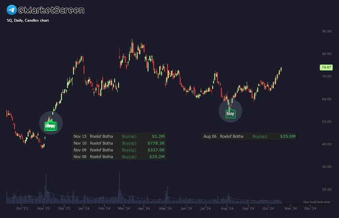 Вот, к примеру, перед вами график цены акций компании Block, Inc., бывшая Square. А зелеными штучками отмечены покупки акций неким гражданином Рулофом Ботой.