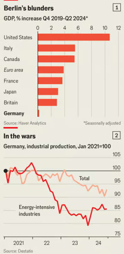 Крупнейшая экономика Европы едва ли продвинулась вперед с момента Ковида, отставая от остального «богатого» мира. Изабель Шнабель из Европейского центрального банка отметила, что с 2021 года экономический рост в еврозоне, за исключением Германии, был “удивительно устойчивым” и опережал темпы роста многих других крупных экономик. Но говорить об экономике еврозоны без Германии - все равно что говорить об американской экономике без Калифорнии и Техаса. Страна, некогда являвшаяся двигателем европейского роста, превратилась в обузу.