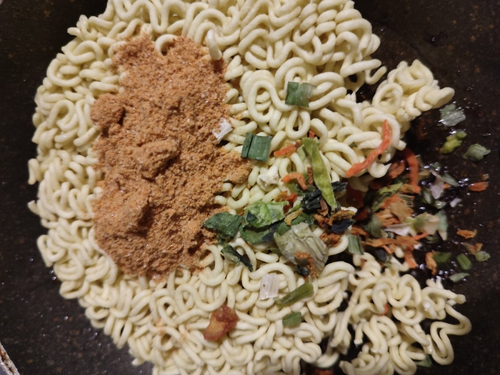 В меру соли, в меру перца, в меру даже сахара. Основной вкус - классический такой рамен, ничего химического, отталкивающего. Хрустские "хлопья" (которых реально много) издалека радостно машут и доносят еле уловимый привкус рыбного азиатского соуса.