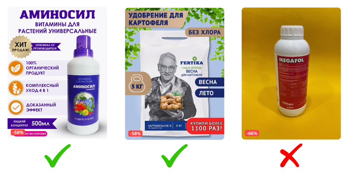 Результат поисковой выдачи по запросу "удобрения". Нам понравились первые варианты: понятный шрифт, указано назначение товара, объем, отличительные свойства. А вот в третьем варианте использован яркий отличающийся фон, но ничего не понятно о самом товаре.