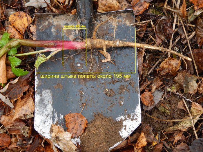 Патрульный не взял с собой рулетку, но известно, что ширина штыка такой лопаты около 195 миллиметров. Сравнивая размеры разных частей изображения, получаем, что расстояние от поверхности грунта до верхней части корня этого передового поста - около 45 миллиметров.