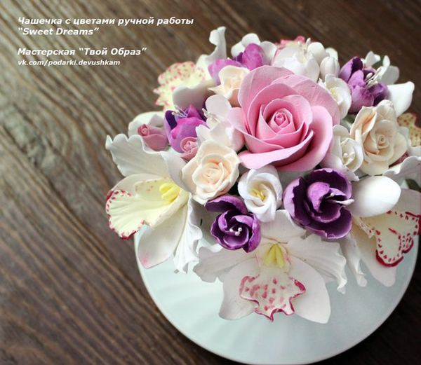 Переходим к композициям поинтереснее. Перед вами работа профессионала. Композицию из полимерной глины используют не только как украшения, но и в качестве декора. Декоративная чаша для тех, кто не хочет раз в неделю покупать новые цветы.
