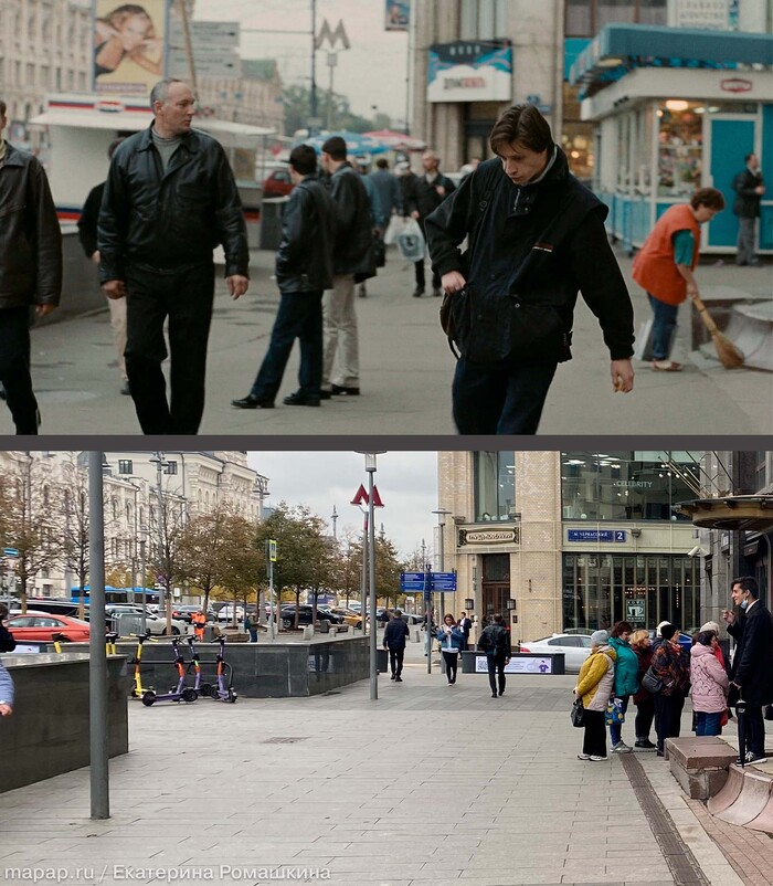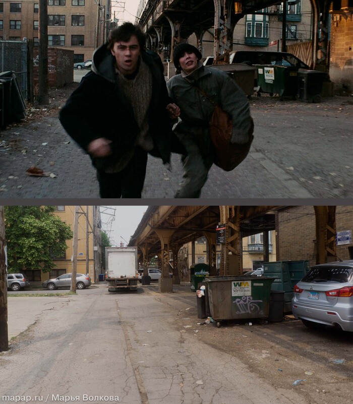 Самый долгий поиск локации, точно около недели. Из ориентиров только эстакада метро. Забавно, что мусорный бак как-будто тот же самый.