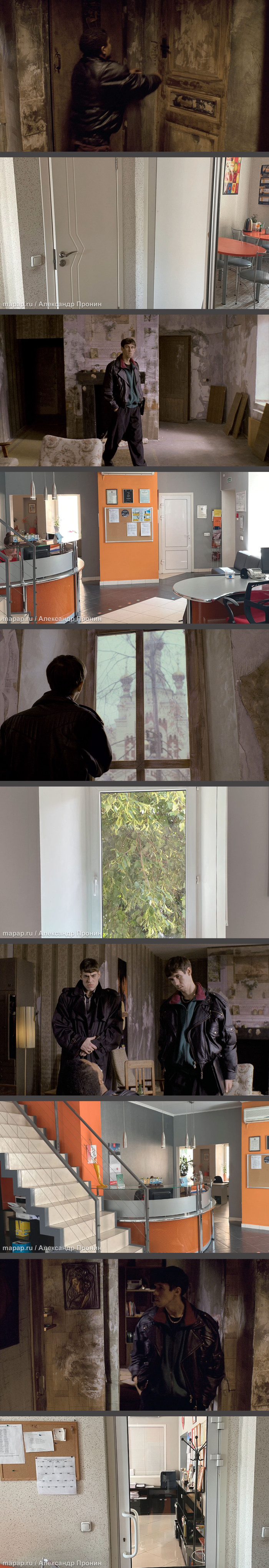Эту локацию пришлось искать вручную. В эпизоде можно увидеть номера домов 43 и 41. Вооружившись адресным перечнем перебрал несколько пар в центре, осматривая на Яндекс панорамах и на 5-6 пару нашел локацию.