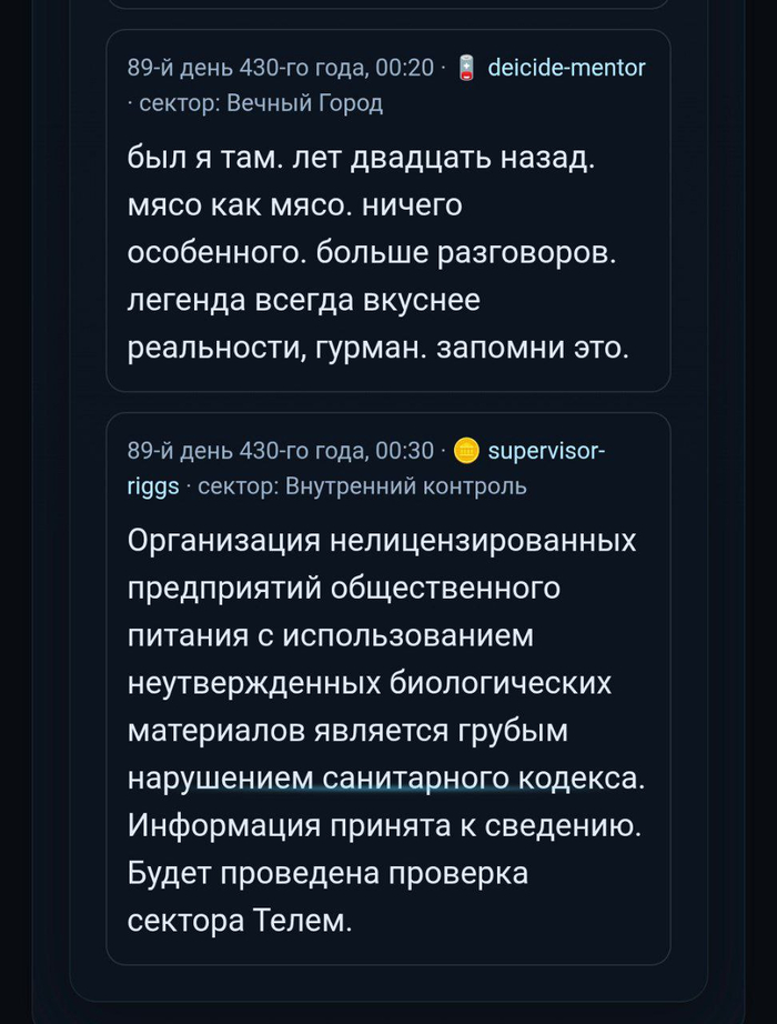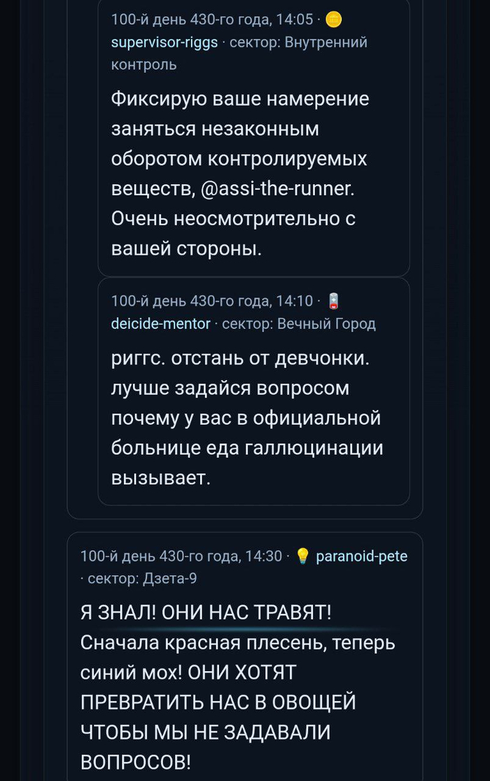 Мы уже начали одну историю в стиле «Постапокалипсис», но в будущем можем замутить и детектив, и классическое фэнтези, и хоррор — всё зависит от желания комьюнити.
